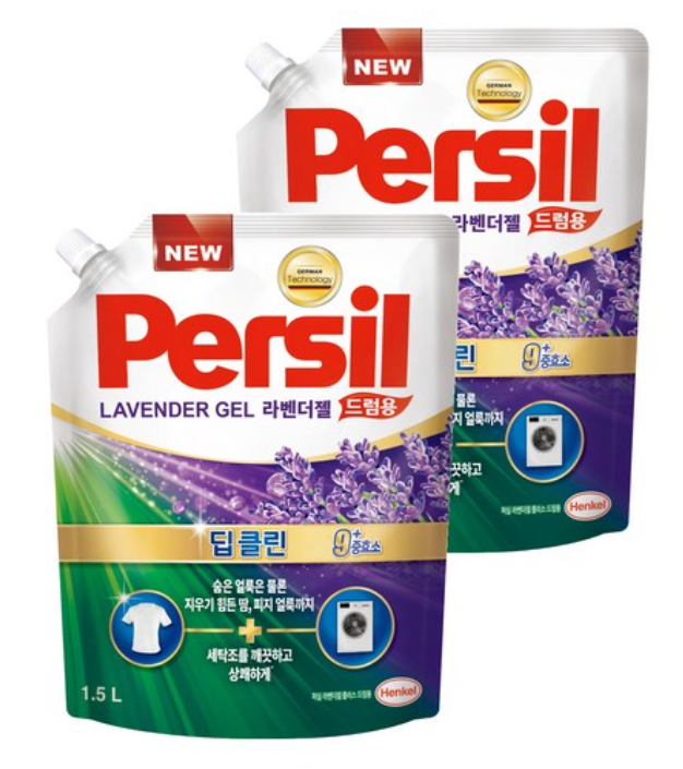 - 제품명: 퍼실 딥클린 9중효소 라벤더젤 드럼용 액상세제 리필 1.5L × 2개